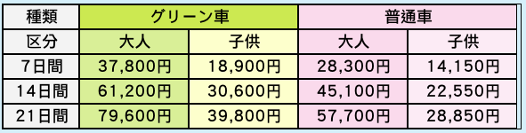 JR PASS 有 大人/小孩, 綠車/普通車, 日數及地區的居別